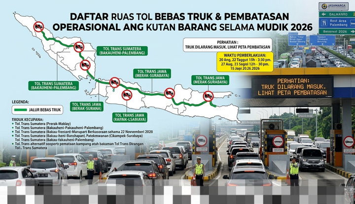 Kebijakan pembatasan truk tidak hanya berlaku di Pulau Jawa. Beberapa ruas tol di Pulau Sumatera juga menerapkan aturan serupa. Hal ini penting karena jalur tol di Sumatera juga menjadi rute utama perjalanan masyarakat selama musim mudik. Beberapa ruas tol yang termasuk dalam daftar pembatasan antara lain: